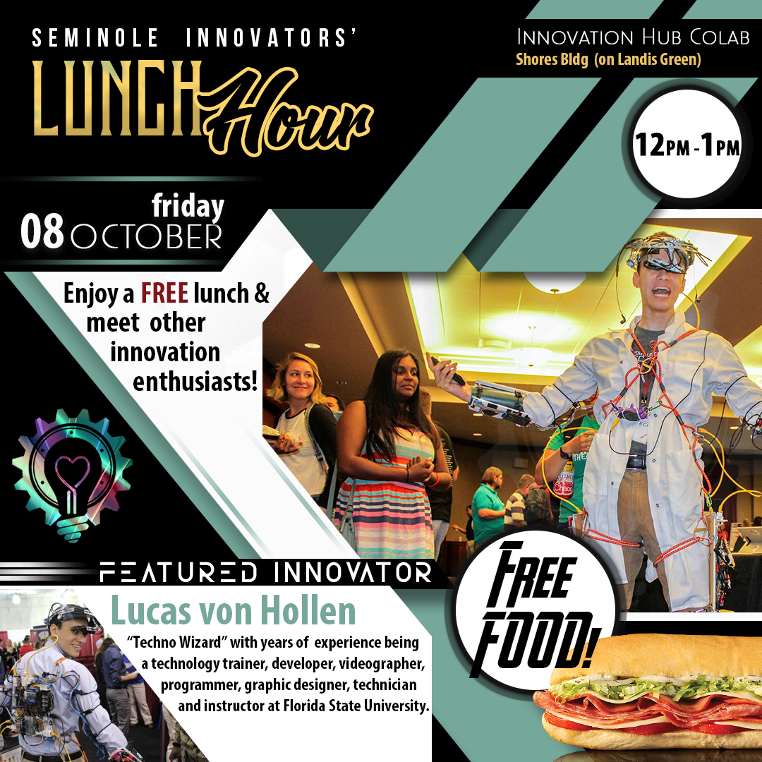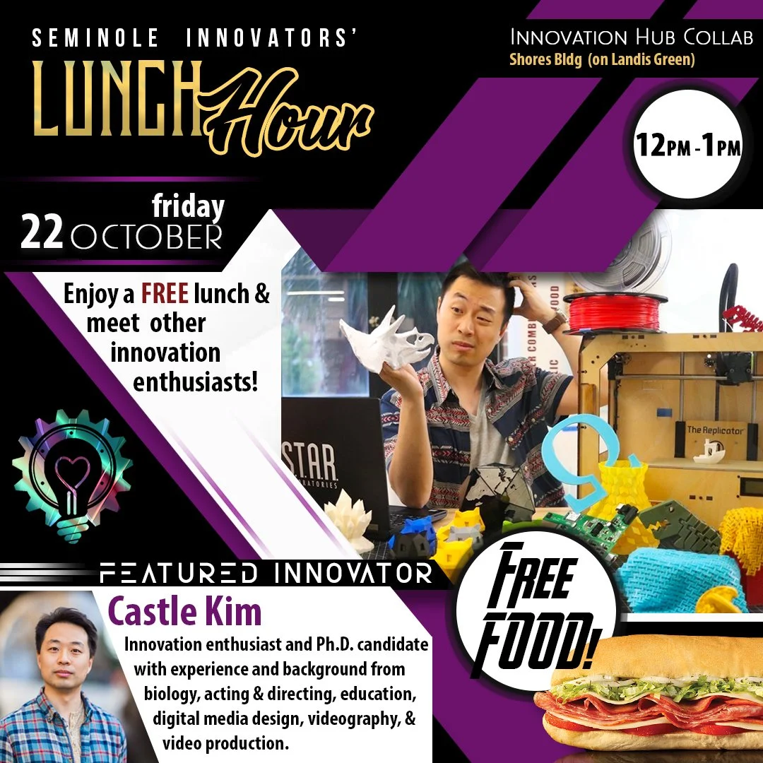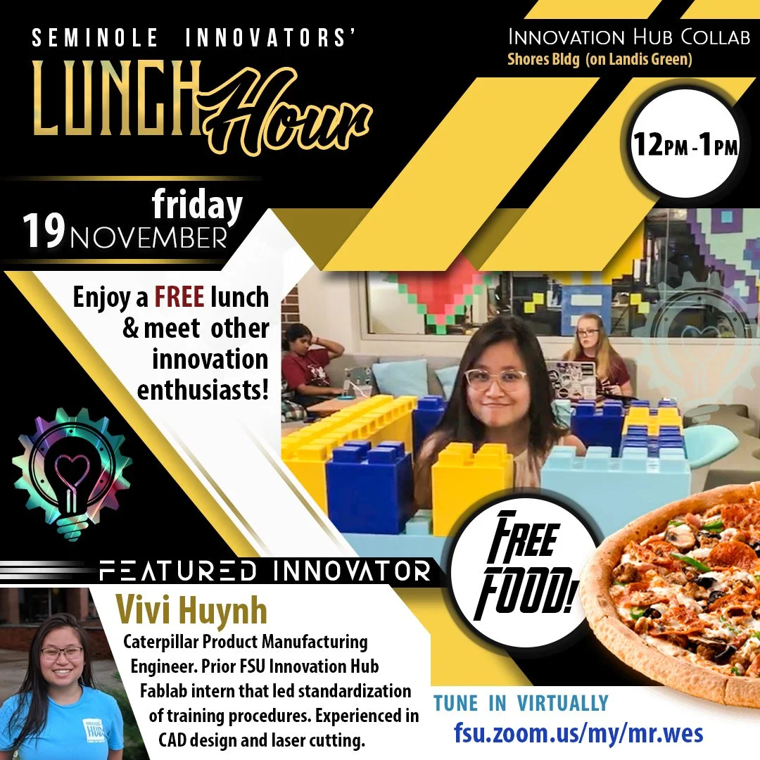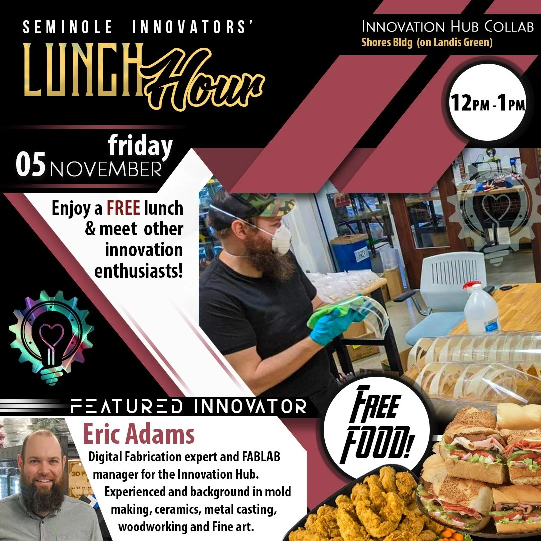 Seminole Innovators' Lunch Hour is held bi-weekly on Fridays at the Innovation Hub featuring a guest speaker and free food provided for all participants.