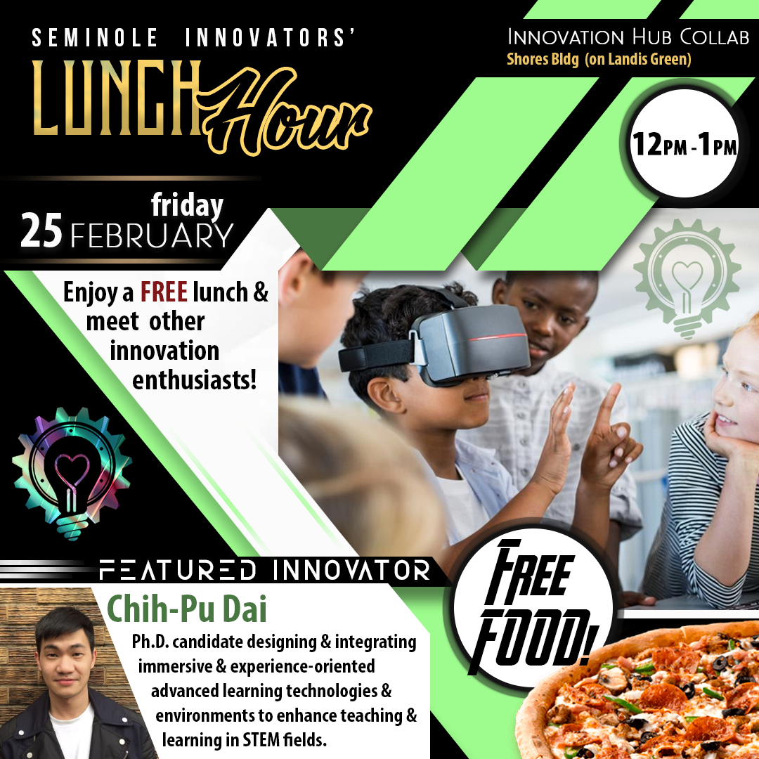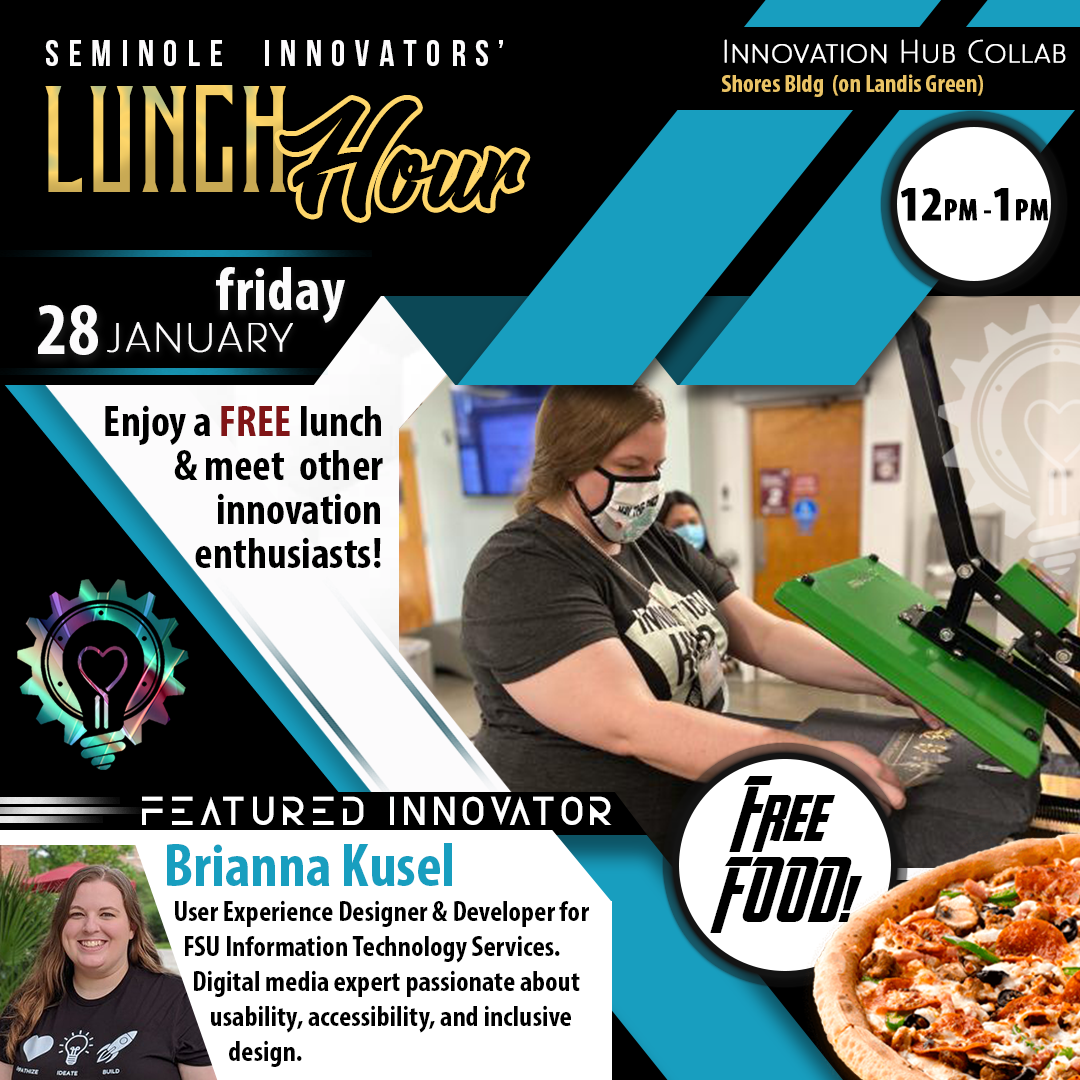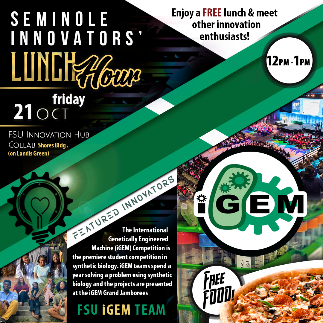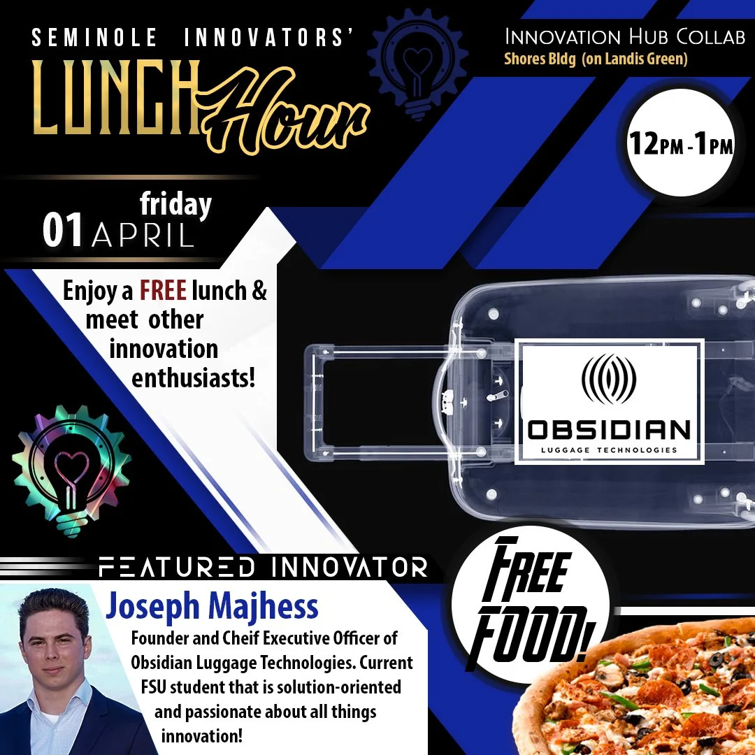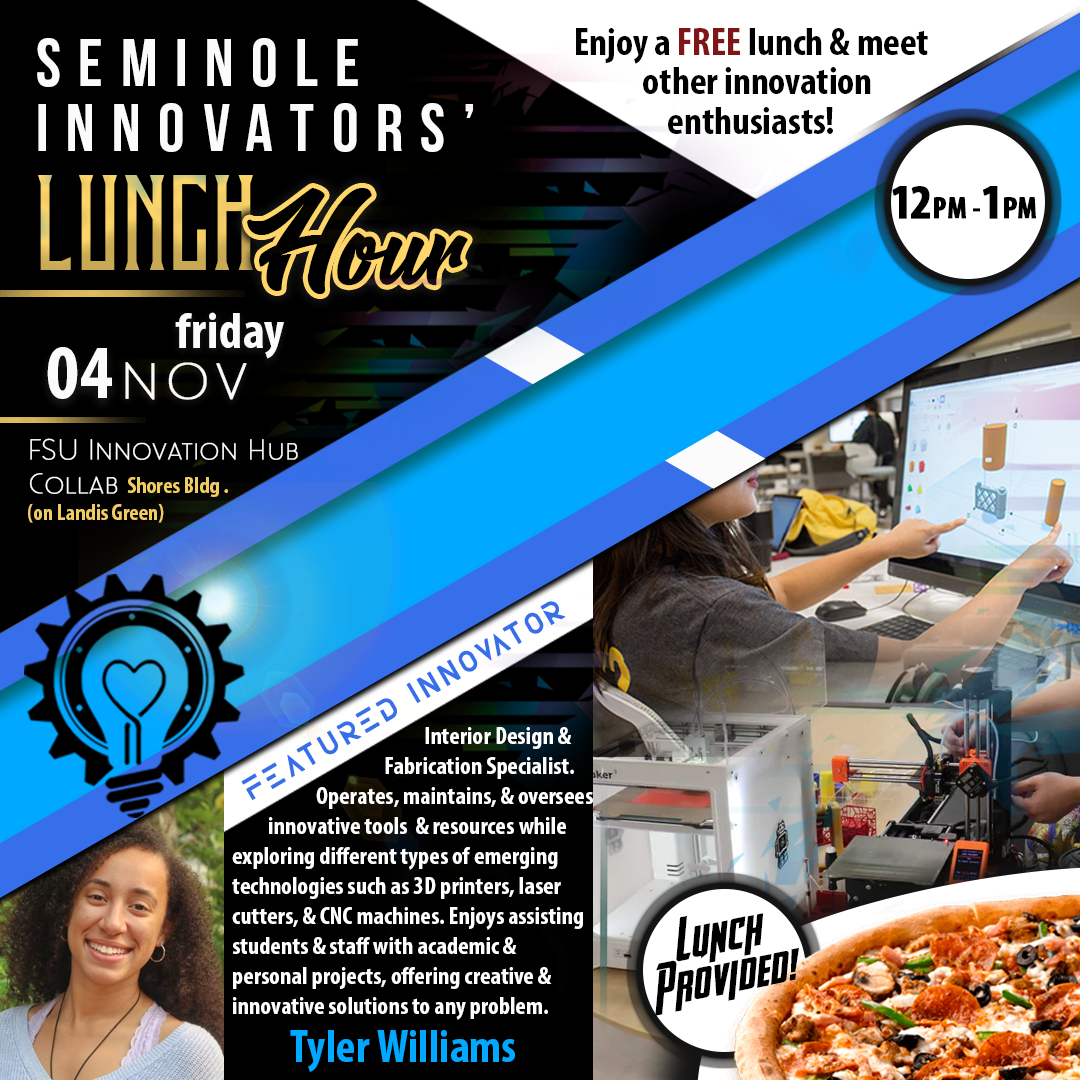 Seminole Innovators' Lunch Hour is held bi-weekly on Fridays at the Innovation Hub featuring a guest speaker and free food provided for all participants.
