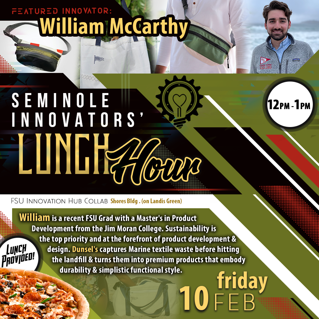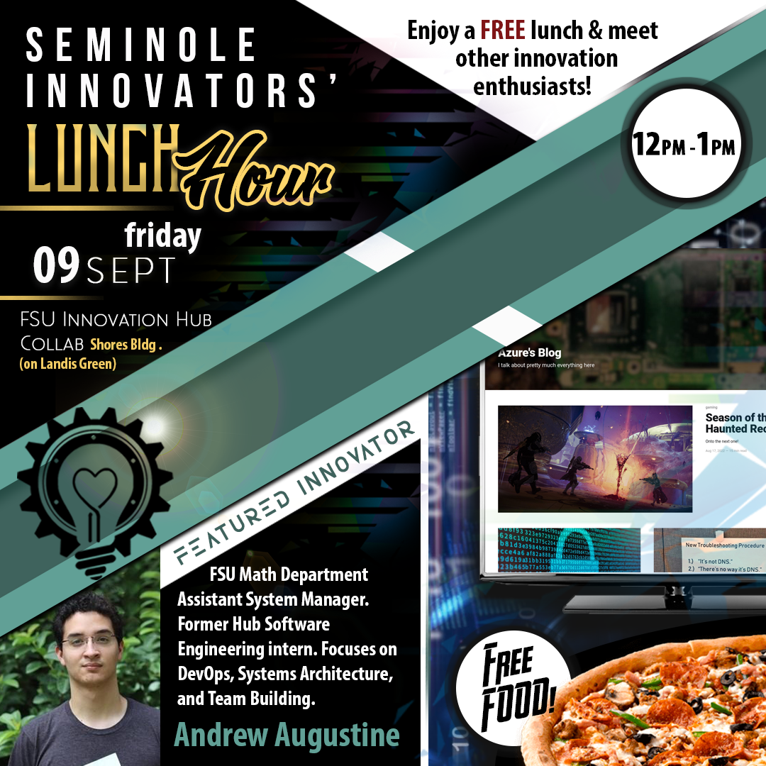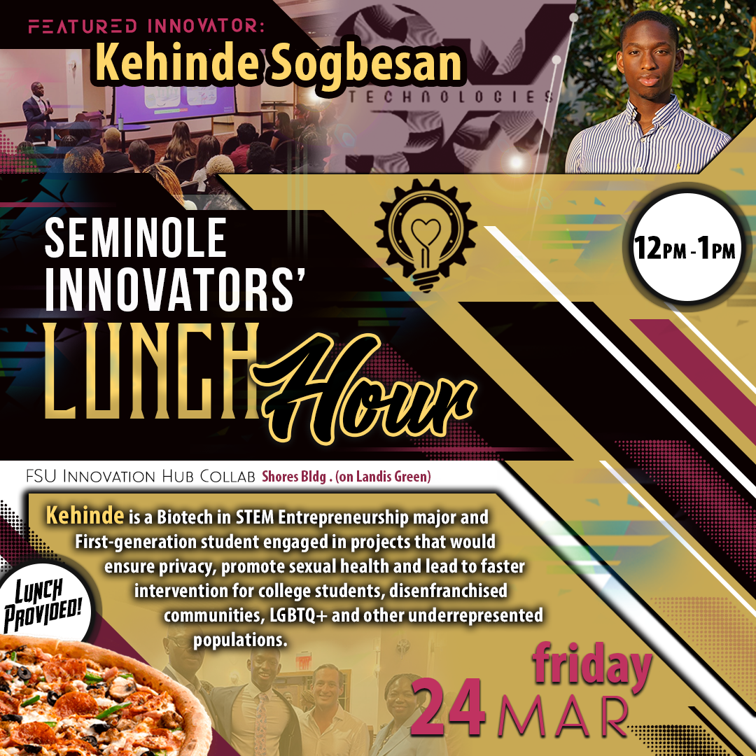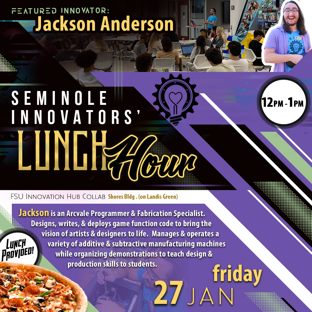 Seminole Innovators' Lunch Hour is held bi-weekly on Fridays at the Innovation Hub featuring a guest speaker and free food provided for all participants.