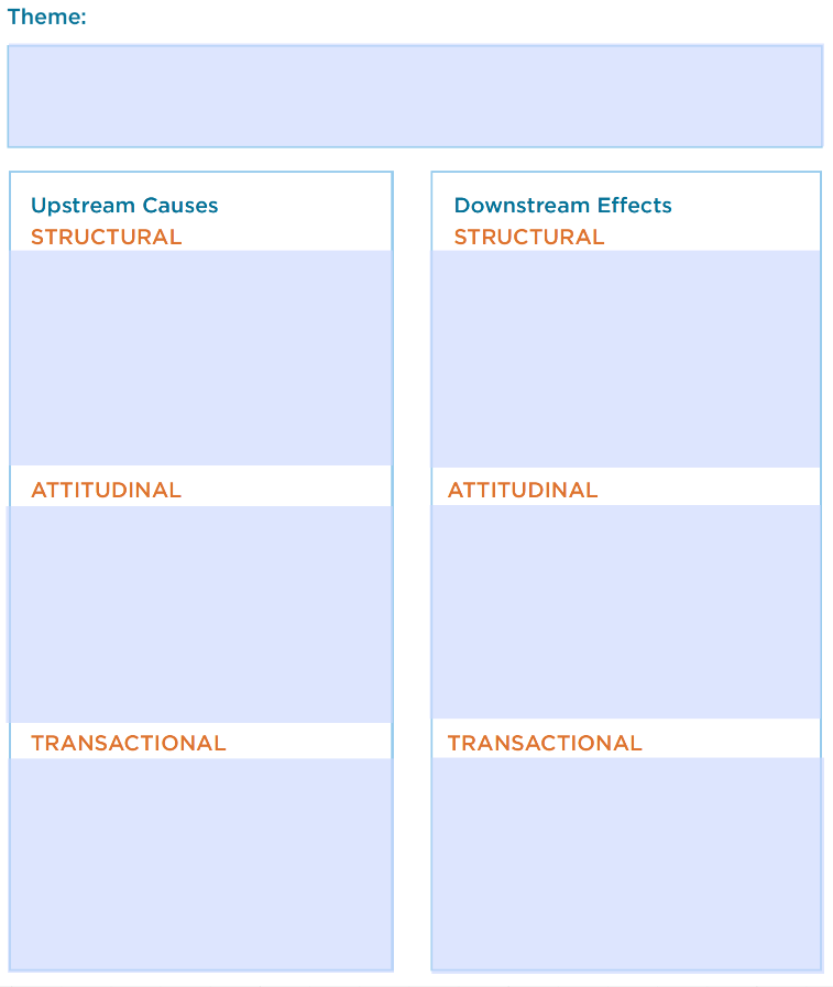 In this step you will do a deep dive into the prioritized themes you captured and begin to explore their upstream causes and downstream effects. We are going to use something called SAT analysis—a structured way of making sure we are looking at the system holistically. The causal relationships we illuminate in this step will be the major inputs for drawing connections between factors in your systems map moving forward.